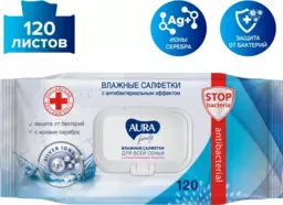 Влажные салфетки Aura с антибактериальным эффектом, 120 шт