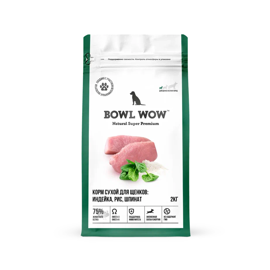 Сухой корм для щенков мелких пород Bowl Wow с индейкой, рисом, шпинатом 2 кг