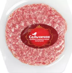Колбаса сырокопченая полусухая Ашан Золотая птица Сальчичон тарелка нарезка, 80 г