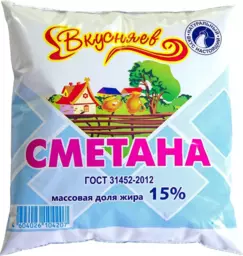 Сметана Вкусняев в пакете 15% Бзмж, 430 г