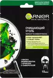 Маска для лица Garnier черная тканевая Очищающий уголь + Черные водоросли с гиалуроновой кислотой увлажняющая сужающая поры 28г