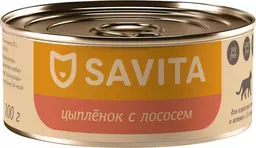Корм Savita Цыпленок с лососем консервированный полнорационный для кошек и котят, 100г