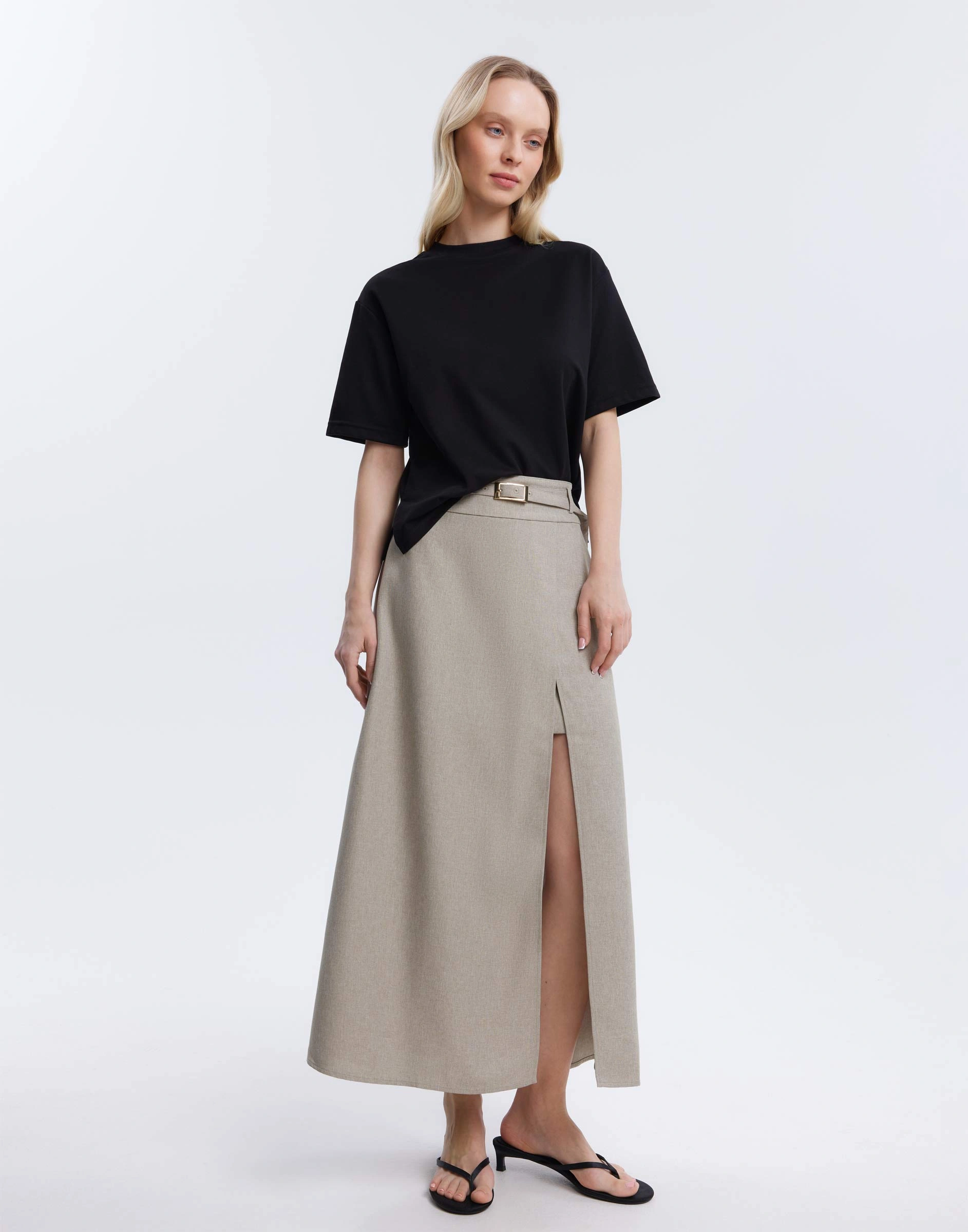 Бежевая макси-юбка с разрезом и ремнём Gsk019285-1
