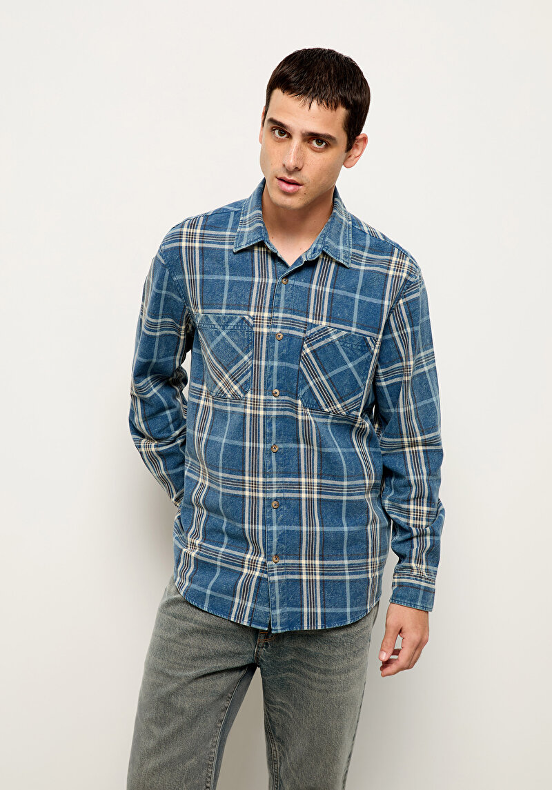 Мужские Голубой Рубашки Длинный Рукав Рубашка Шеи Клетка Хлопок Пуговицы Comfort Fit 47152