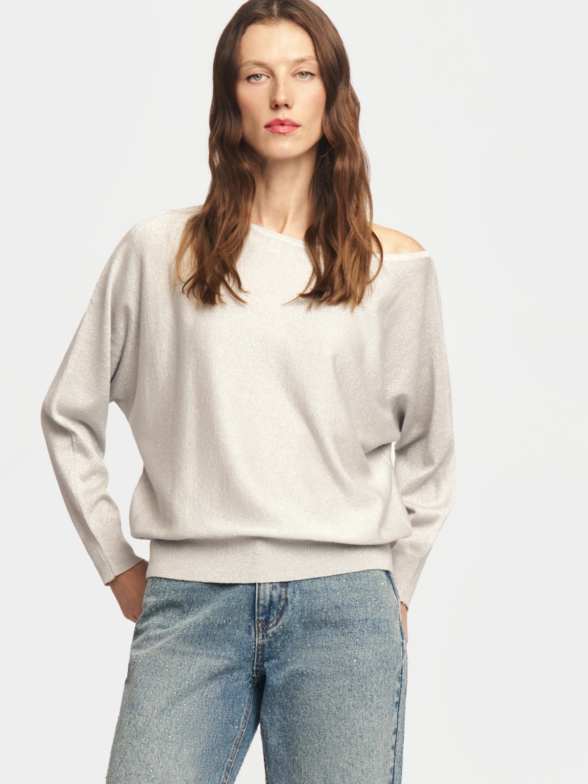 Трикотажный джемпер с люрексом и вырезом на плечо