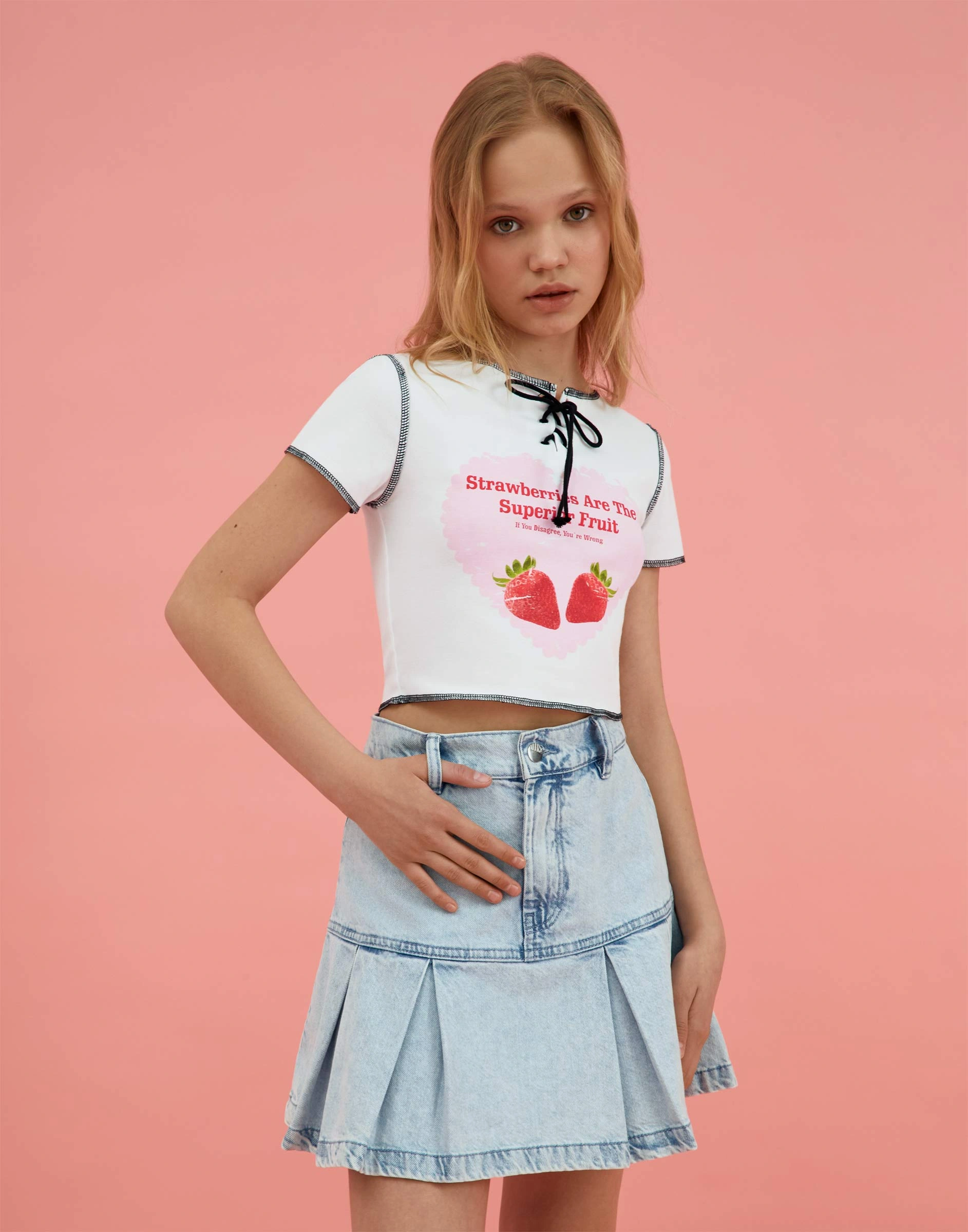 Белая укороченная футболка в рубчик с принтом и шнуровкой Gkt026786-3