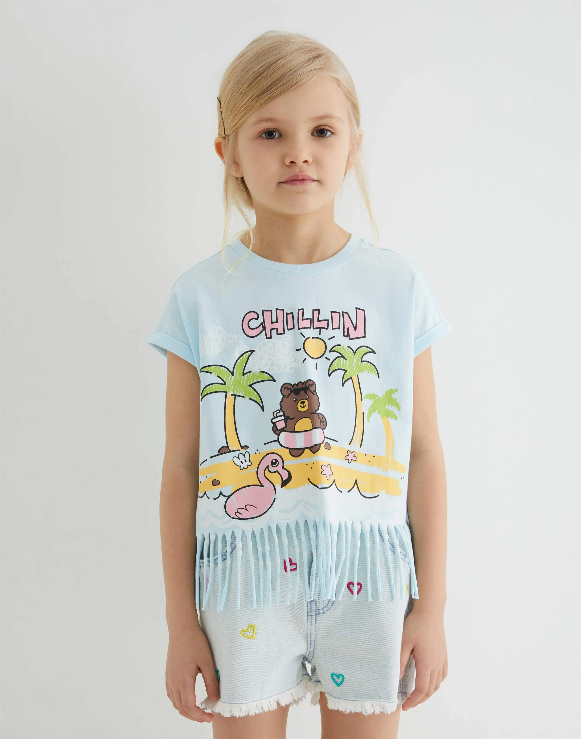 Голубая футболка oversize с принтом и бахромой для девочки Gkt026662-2