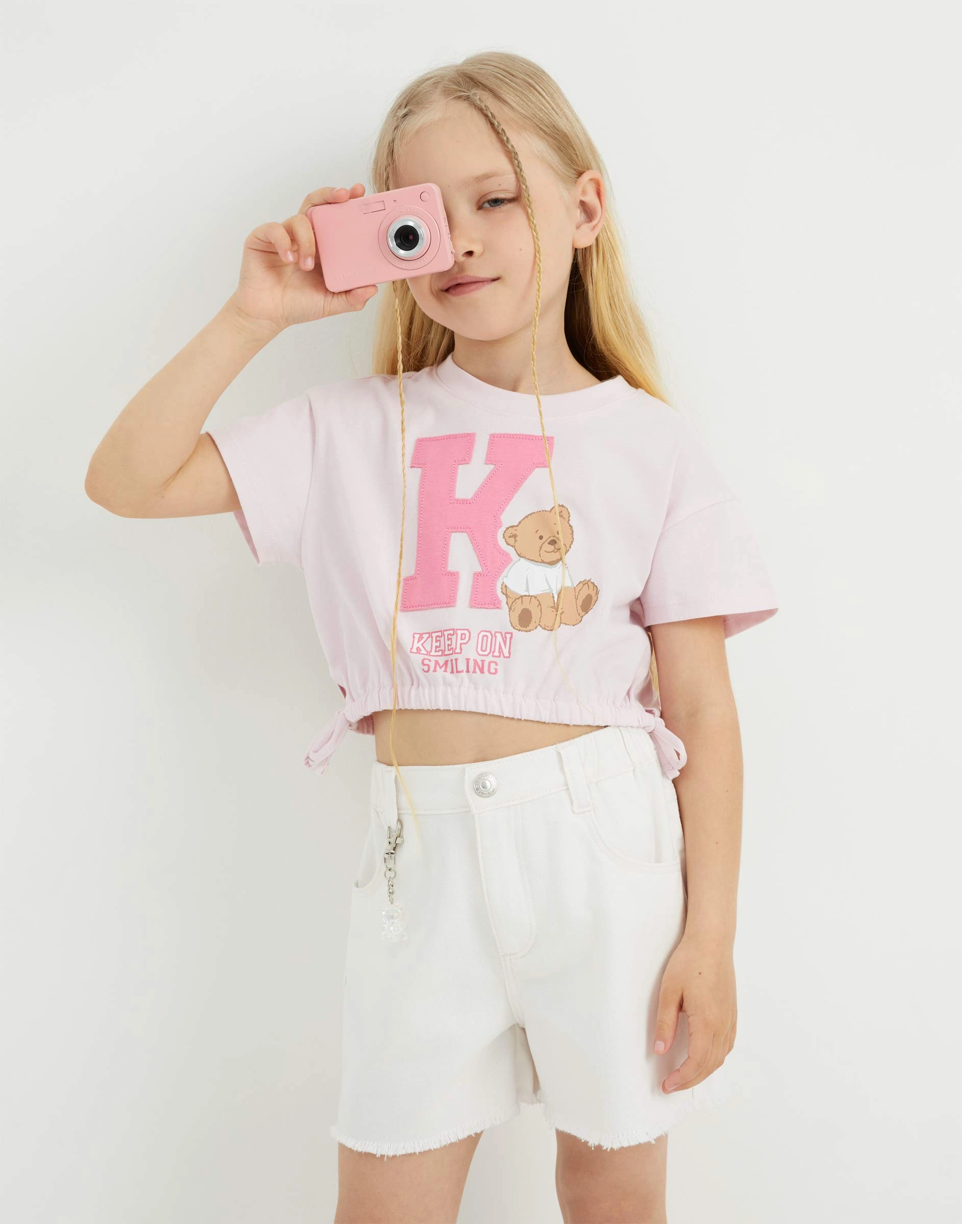 Светло-розовая укороченная футболка oversize с завязками для девочки Gkt026698-2