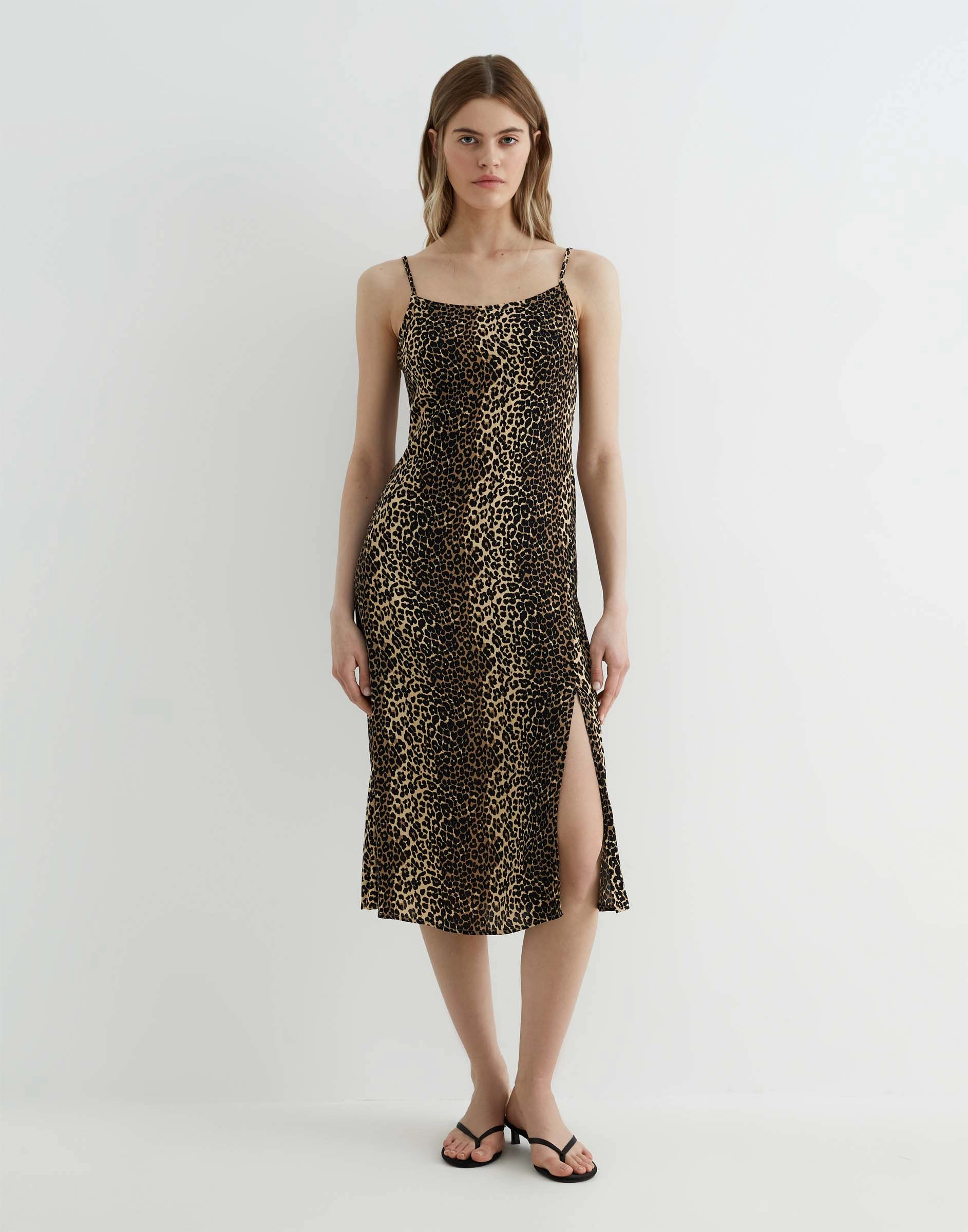Бежевое платье на бретелях с принтом и разрезом Gdr030083-1
