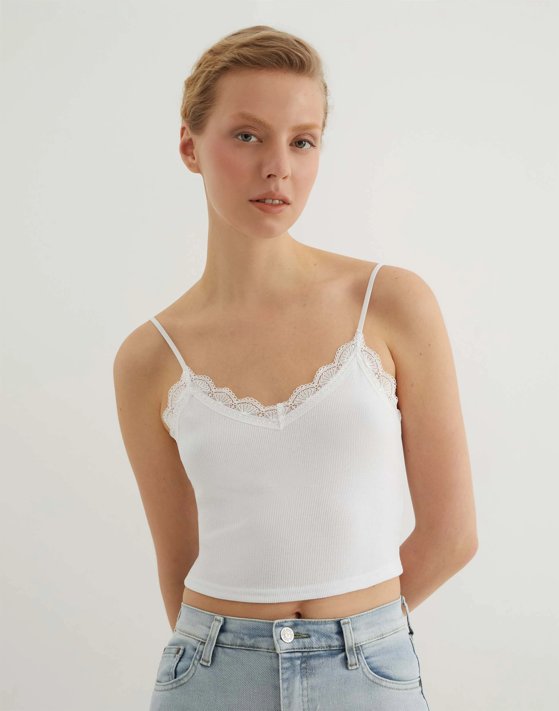 Белый кроп-топ в рубчик с кружевной окантовкой Gtn004490-2