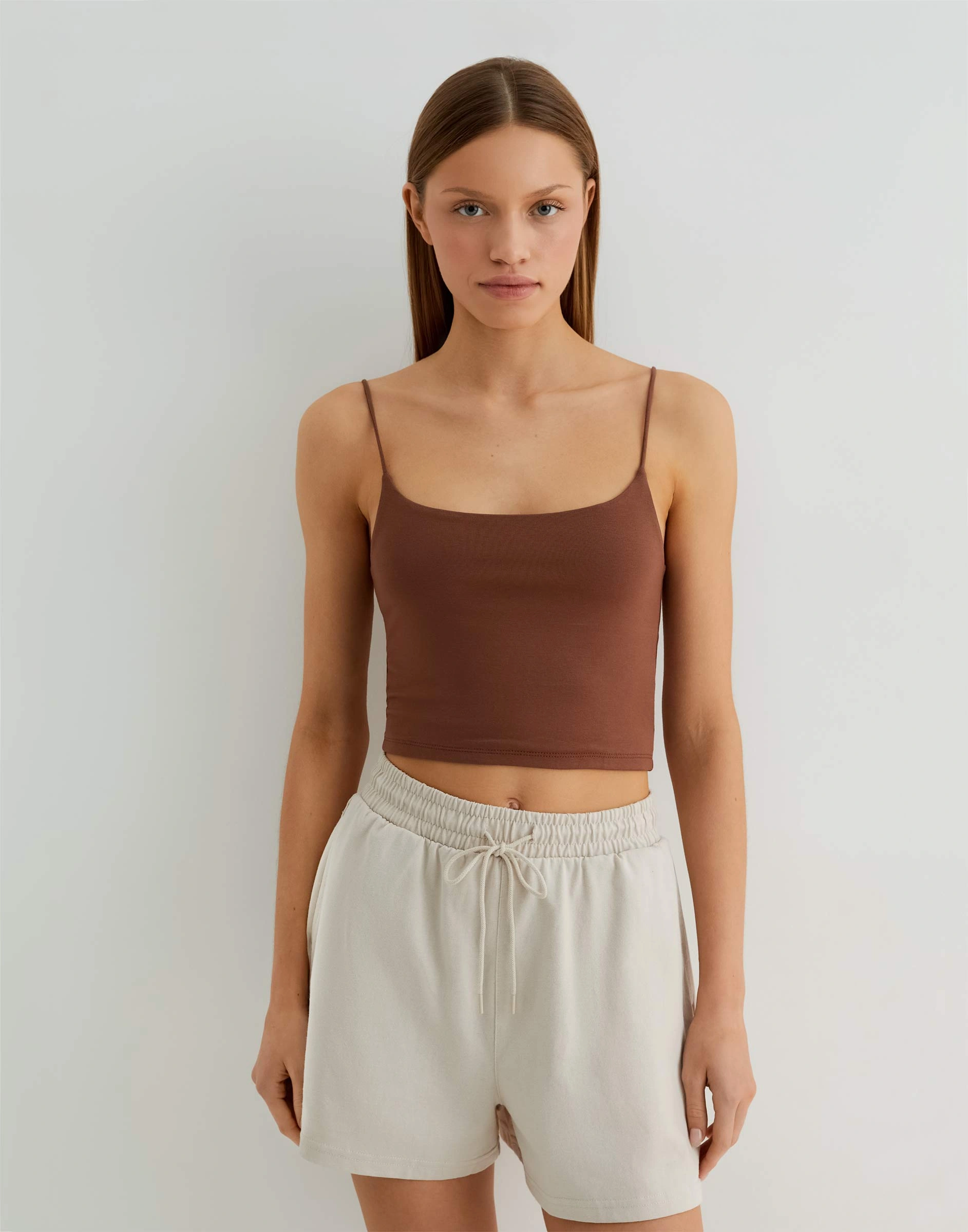 Коричневый базовый кроп-топ на тонких бретелях Gtn004680-2