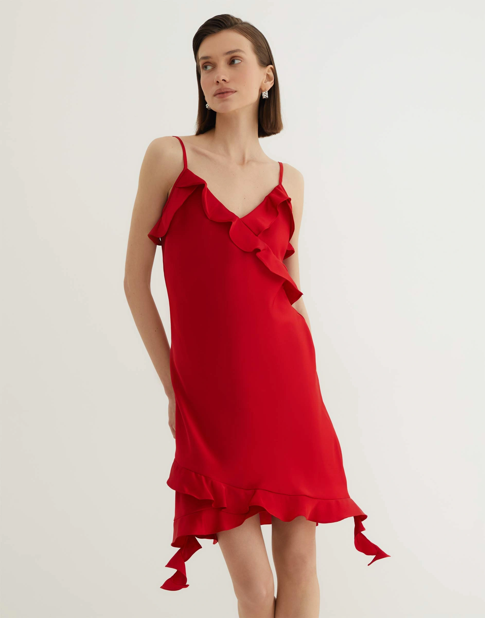 Красное сатиновое платье-комбинация с рюшами Gdr029653-1