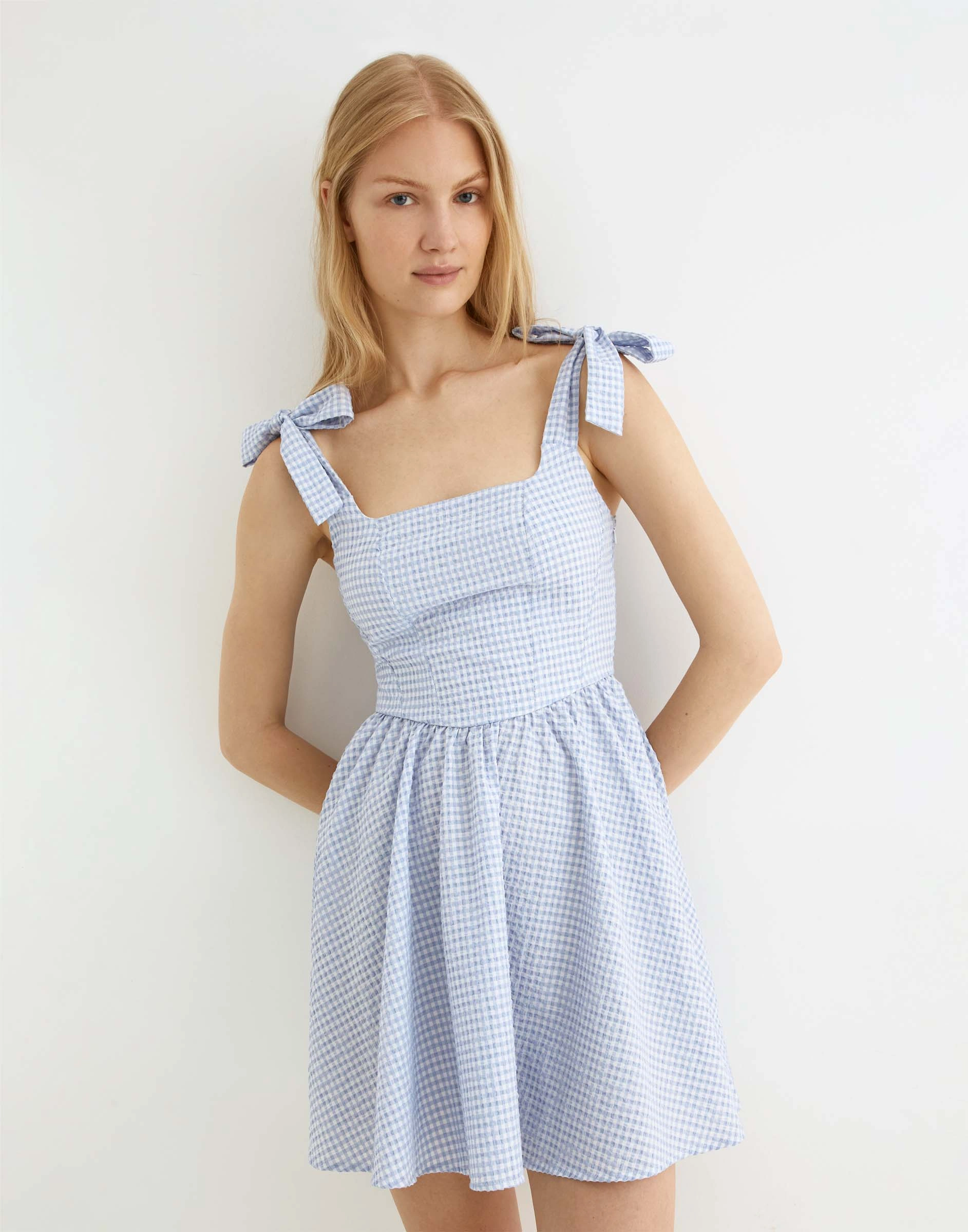 Синее мини-платье в клетку на бретелях Gdr030279-2
