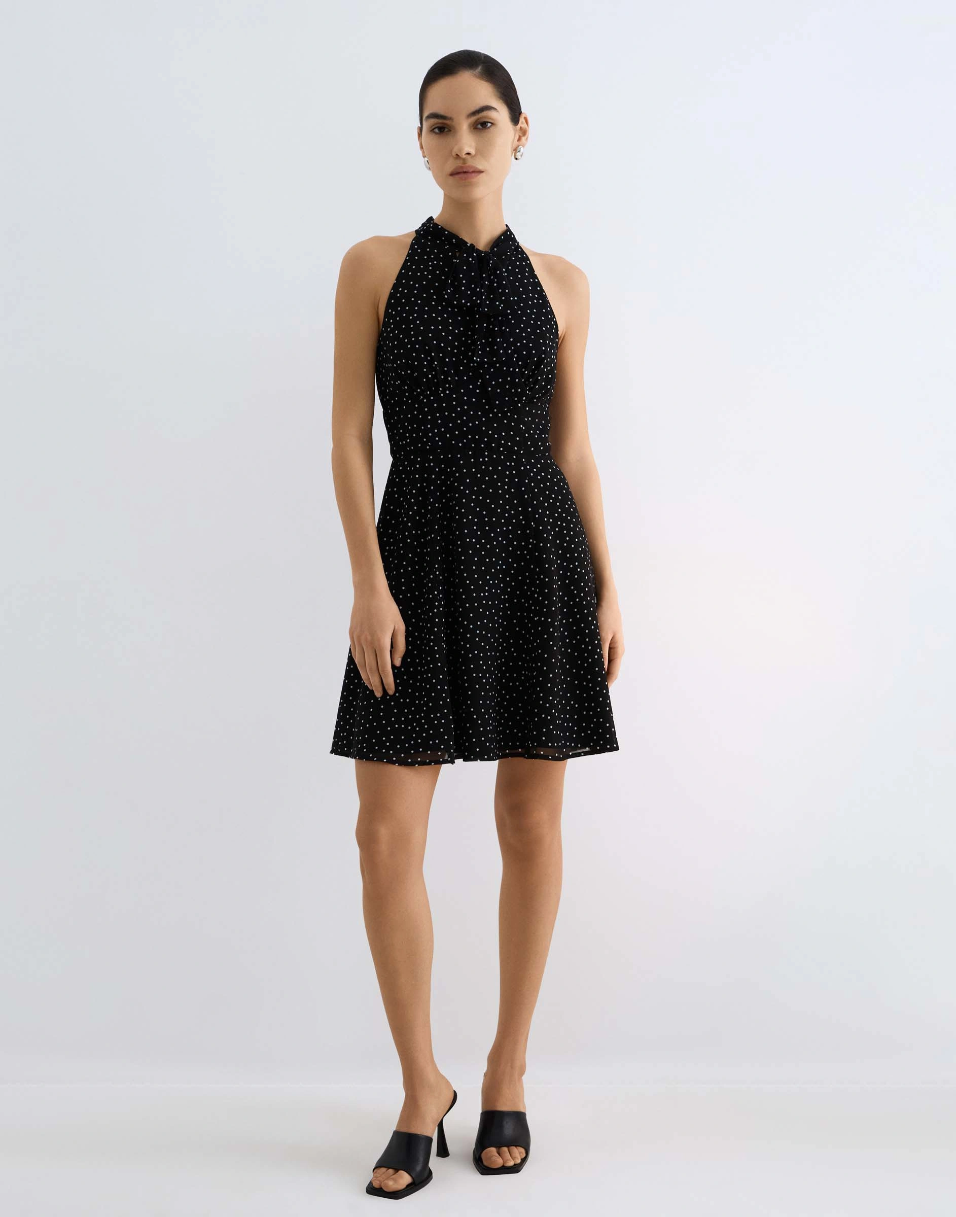 Чёрное платье в горошек с вырезом-халтер на завязках Gdr028437-2