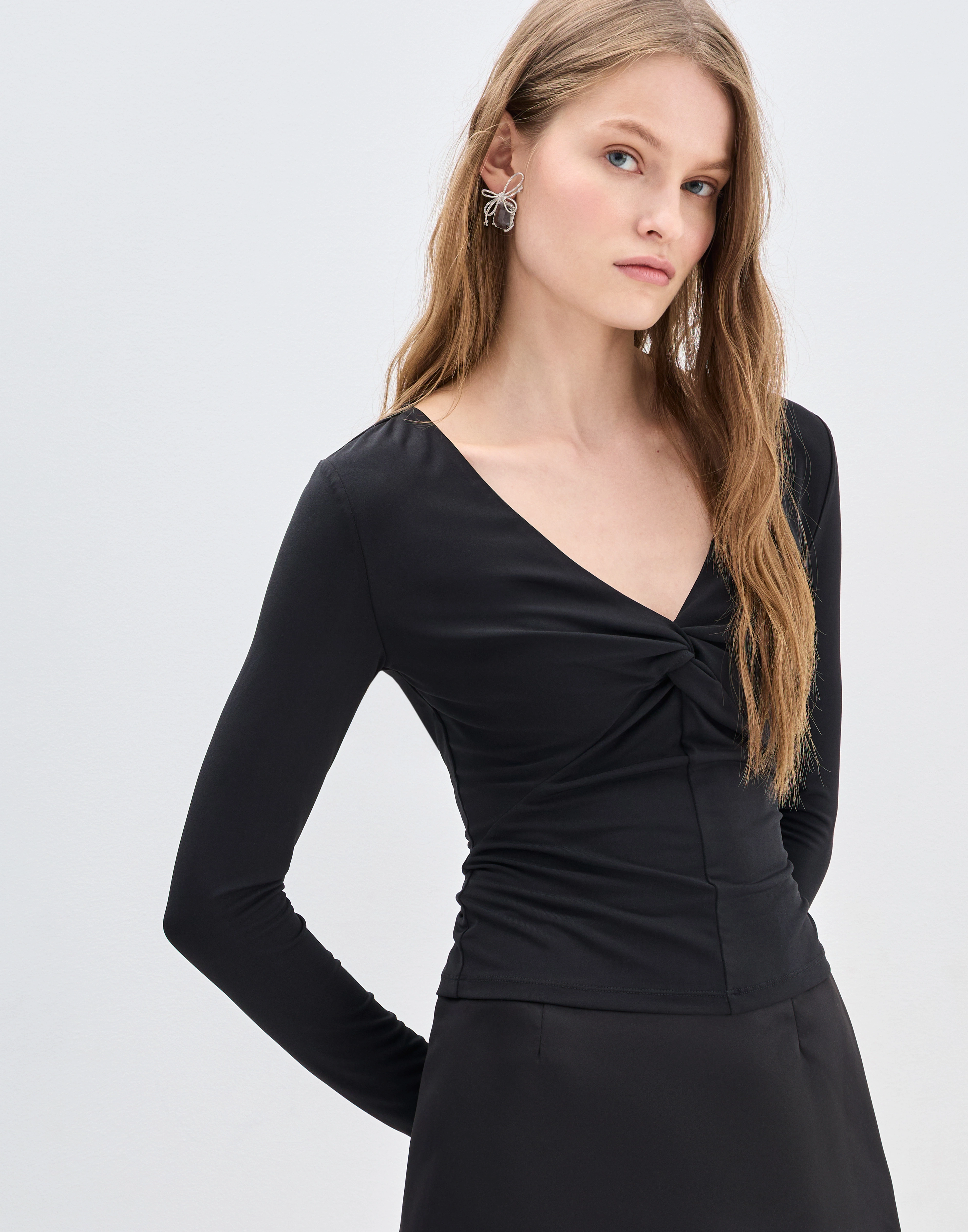 Чёрный лонгслив с узлом на груди Gkt028564-1