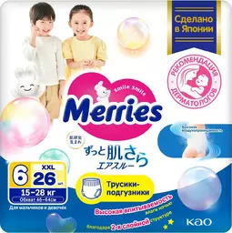 Трусики-подгузники Merries для детей размер Xxl / 6 (15-28 кг), 26 шт