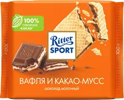 Шоколад молочный Ritter Sport с начинкой какао и вафли, 100г