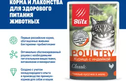 Корм влажный Blitz Classic для взрослых кошек с курицей и индейкой, кусочки в желе, 85г