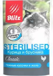 Корм влажный Blitz Classic для стерилизованных кошек с курицей и брусникой, кусочки в желе, 85г