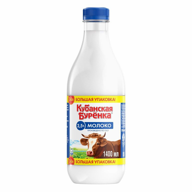Молоко пастеризованное Кубанская Буренка 2.5%, 1.4л