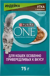 Влажный корм Purina One для кошек особенно привередливых к вкусу с уткой и печенью, 75г