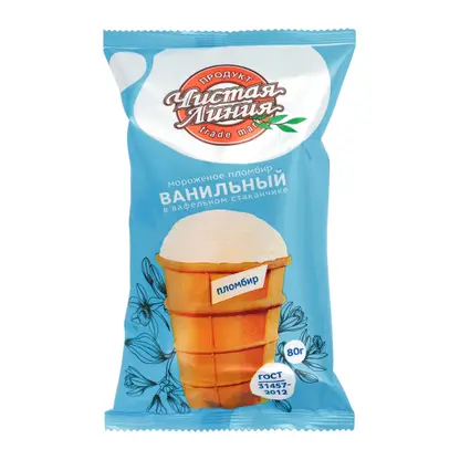 Мороженое Чистая Линия Пломбир Ванильный в вафельном стаканчике 12% 80г