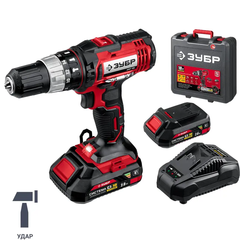 Дрель-шуруповерт аккумуляторная ударная Зубр Дшу-185-22, 18 в Li-ion 2x2 Ач