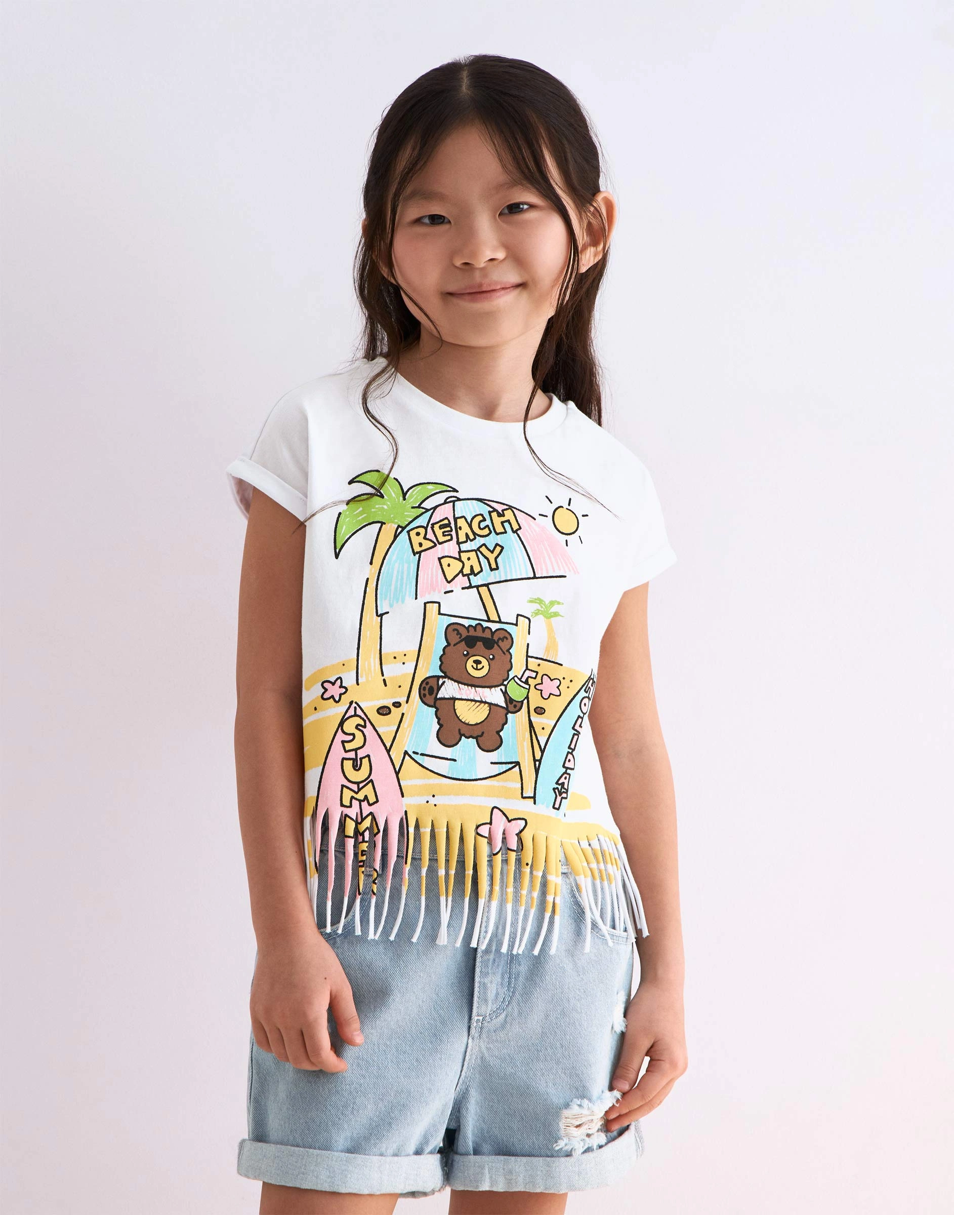 Белая футболка oversize с принтом и бахромой для девочки Gkt026662-1