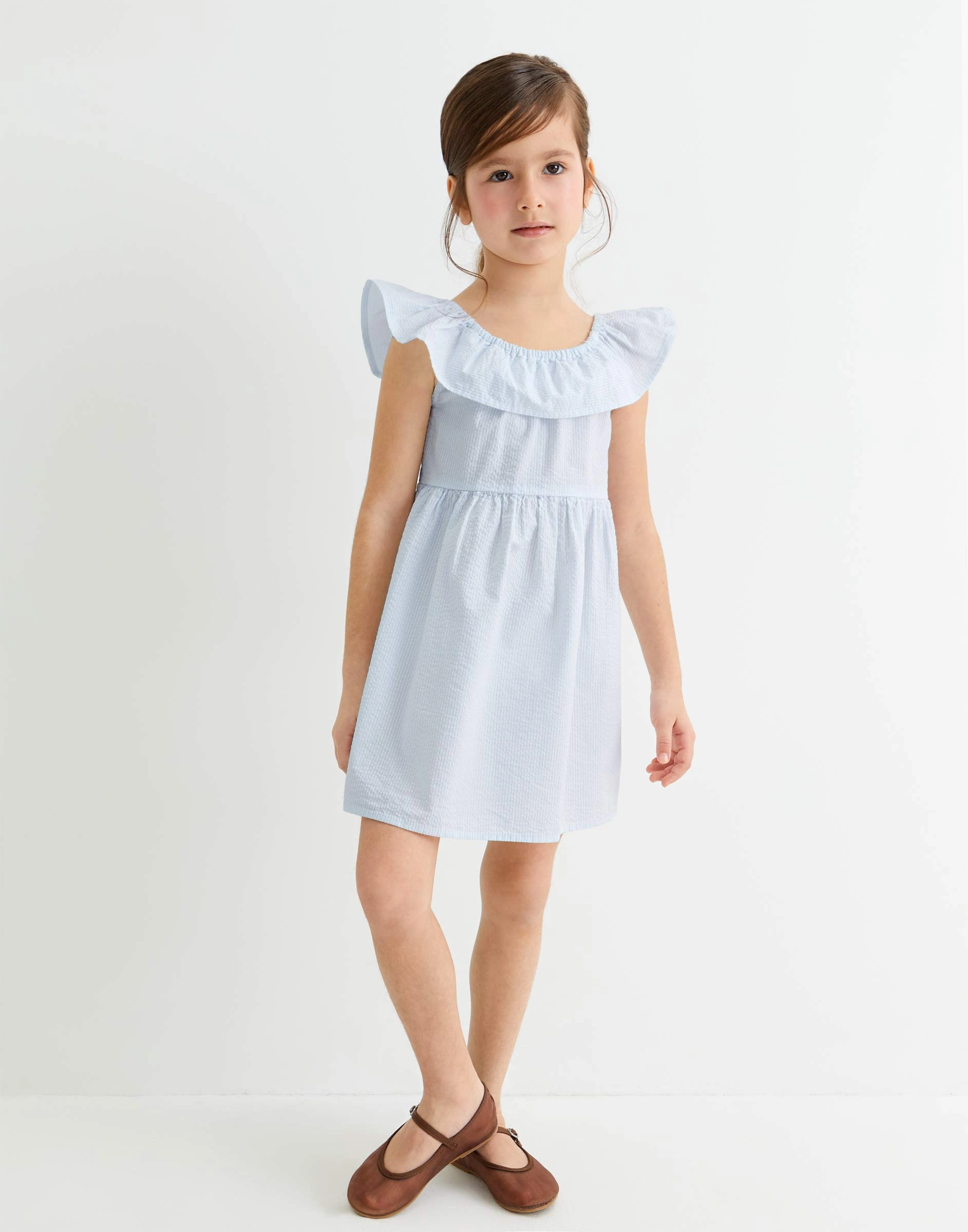 Голубое платье из жатого ситца в полоску для девочки Gdr029770-1