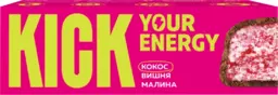 Батончик кокосовый Kick Your Energy, с вишней и малиной в карамельном шоколаде, без сахара, 45г