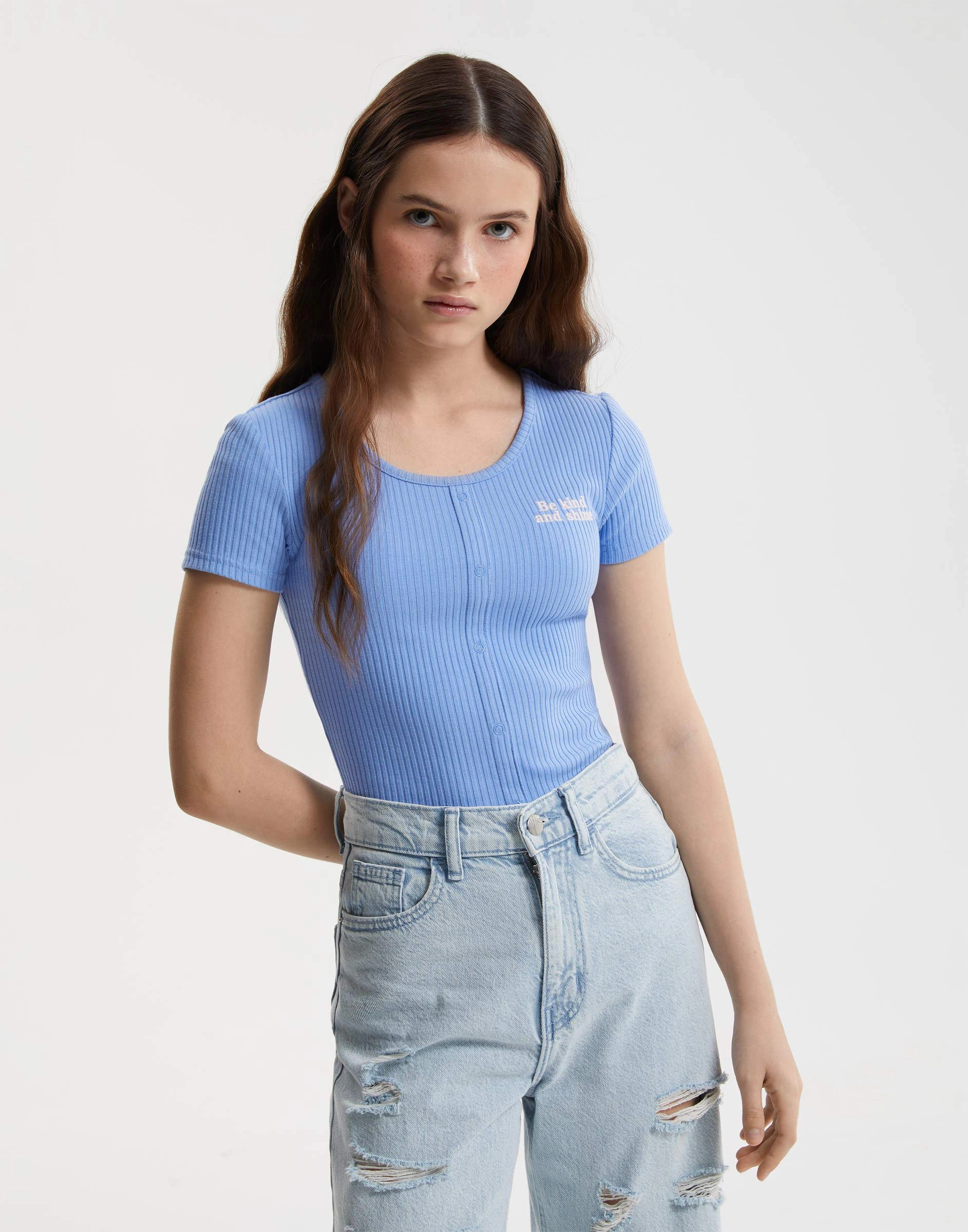 Синий кроп-топ в рубчик с вышивкой Gkt026789-2