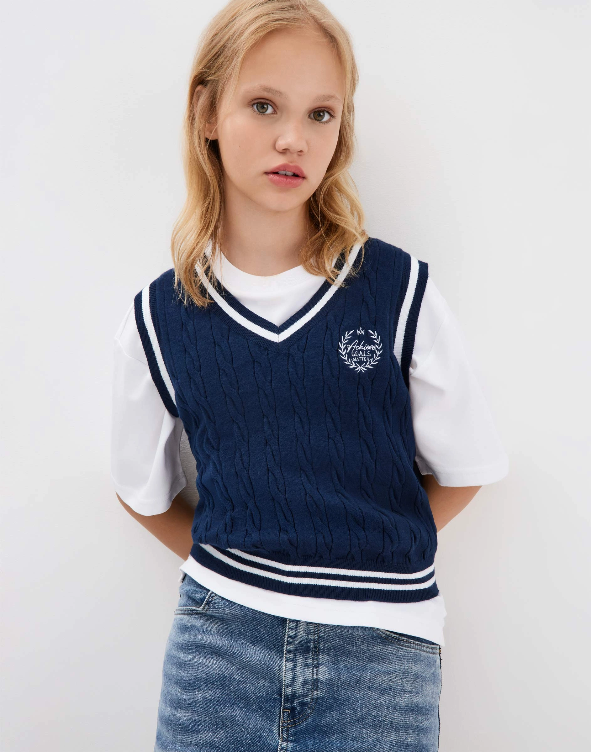 Тёмно-синий вязаный жилет с косами Gsw007826-1