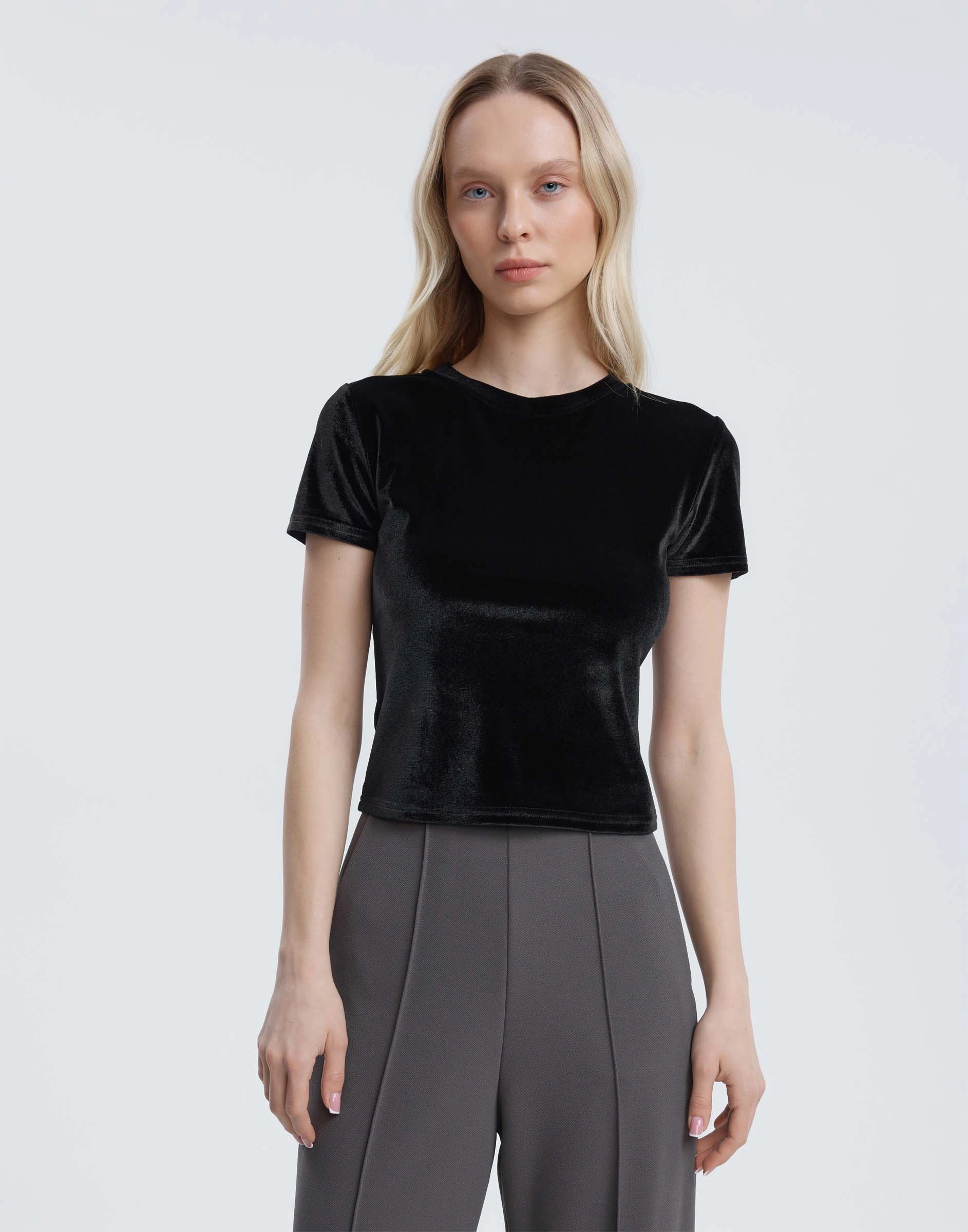 Чёрная укороченная футболка из велюра Gkt026142-1