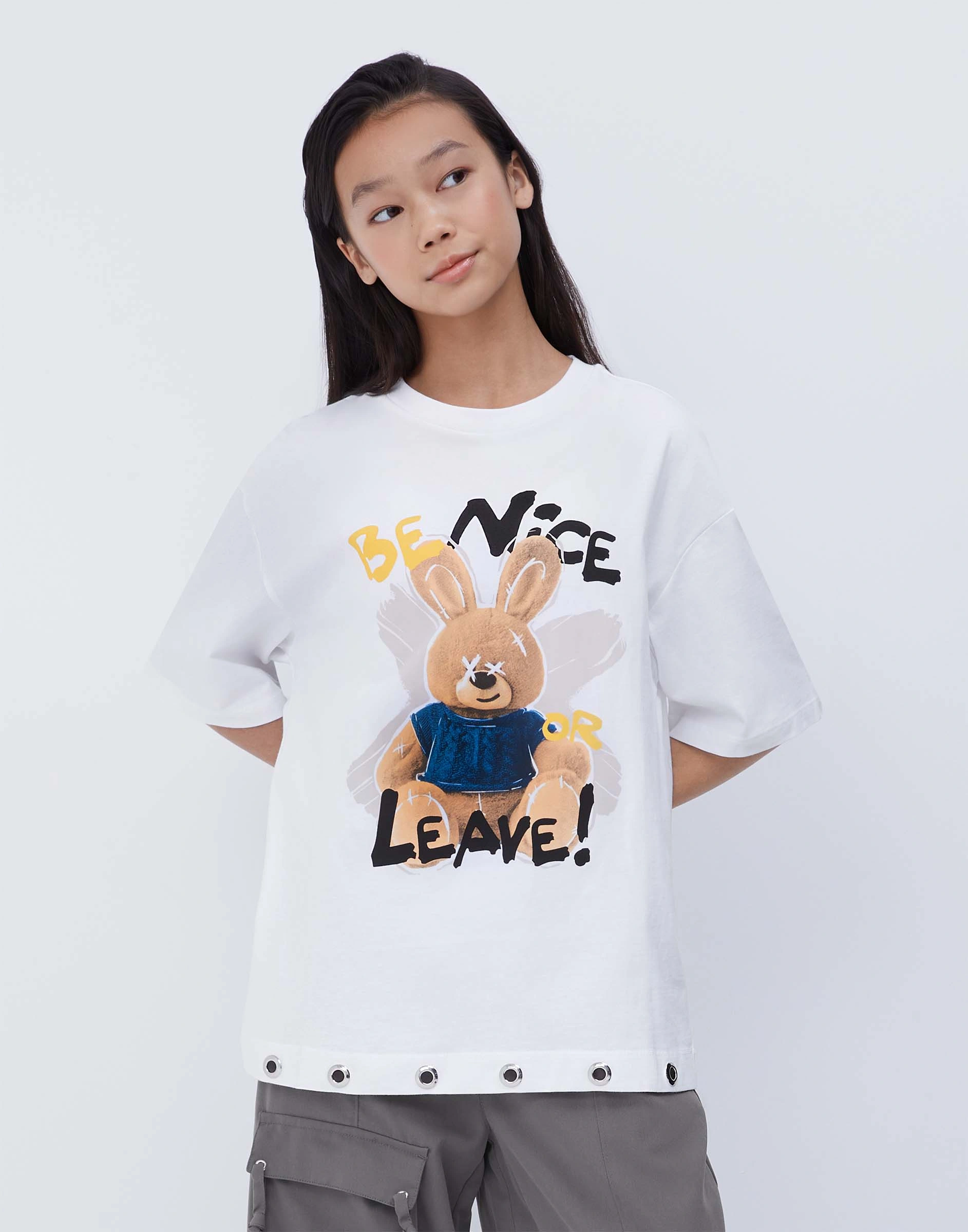 Белая футболка oversize с принтом и люверсами Gkt025727-2