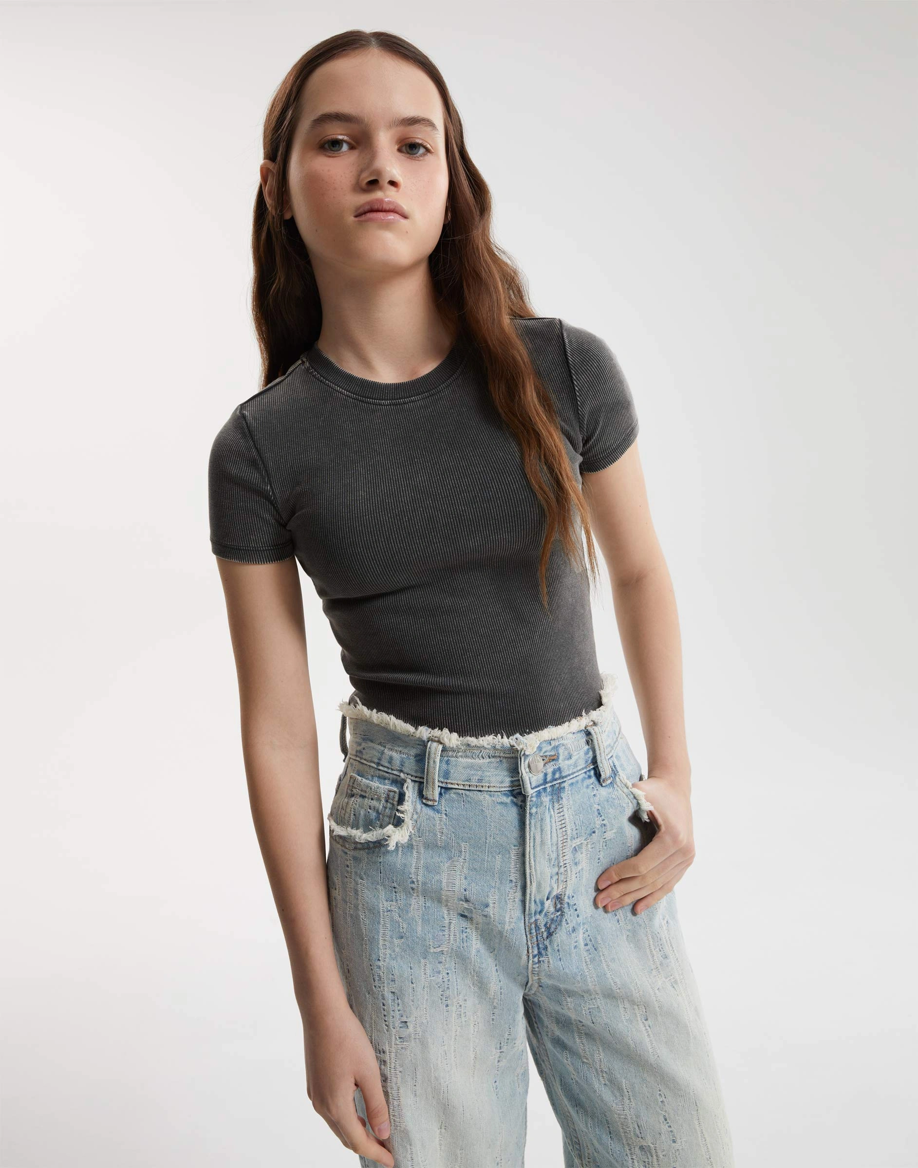 Тёмно-серая облегающая футболка в рубчик с эффектом варки Gkt027224-1