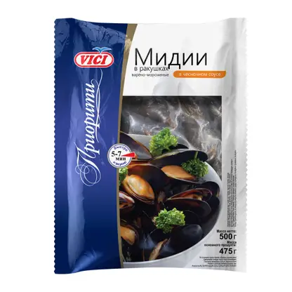 Мидии в ракушках Vici Приорити варено-мороженые в чесночном соусе 500г