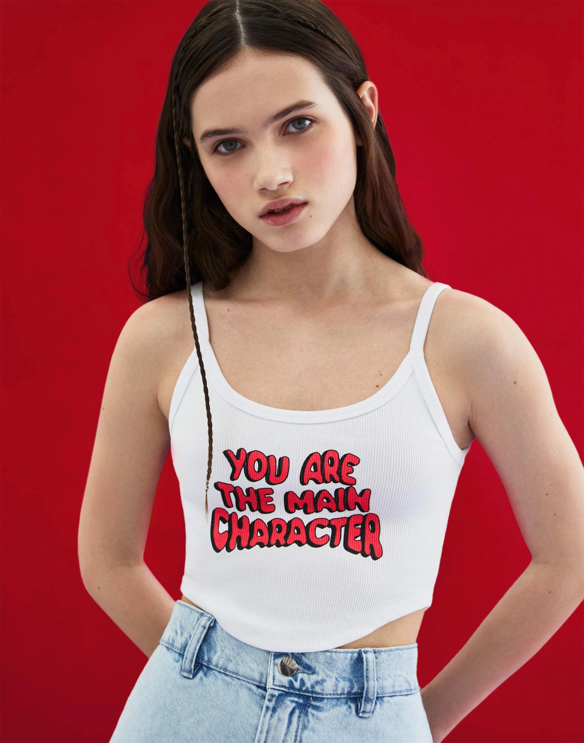 Белый кроп-топ в рубчик с принтом Gtn004584-1
