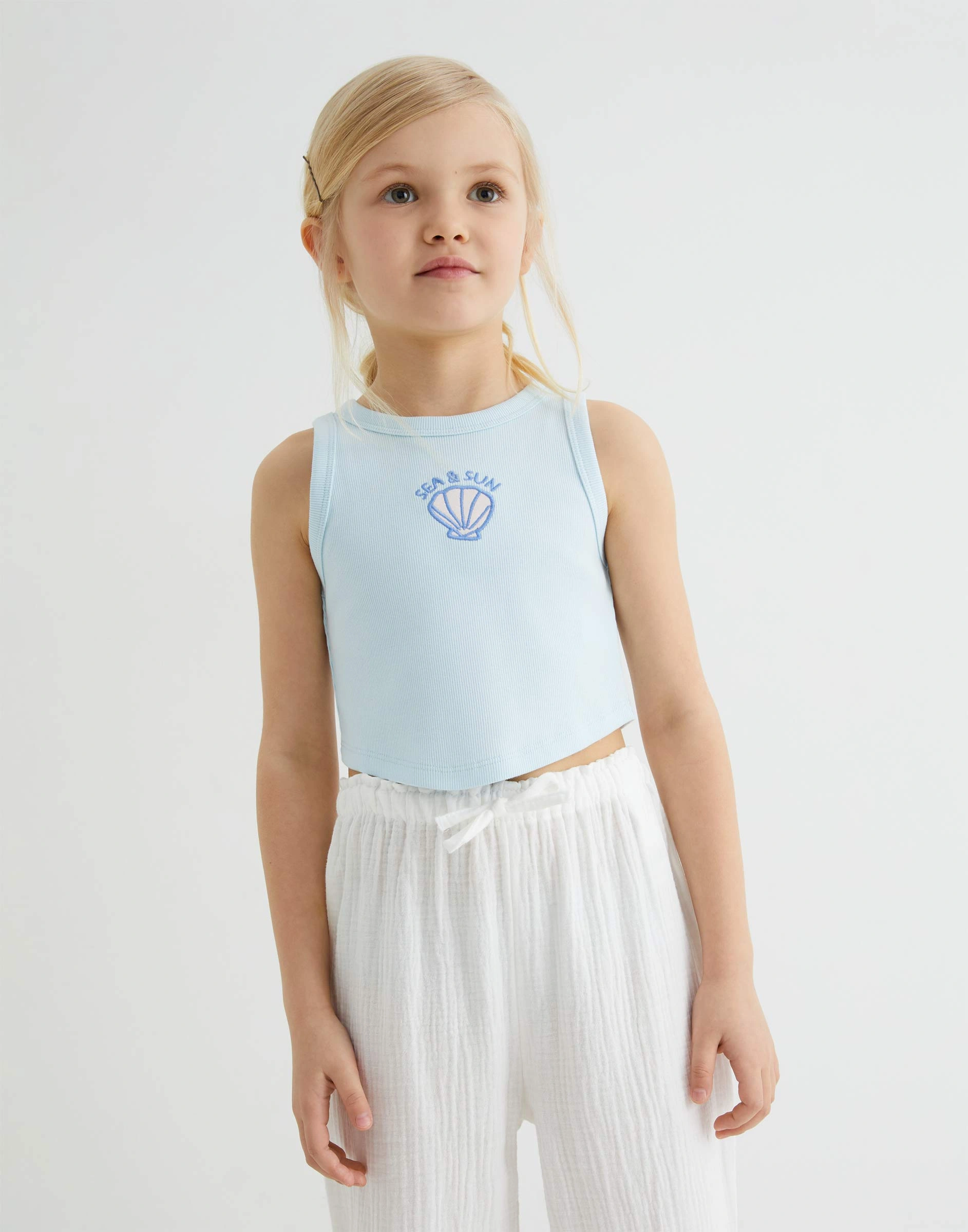 Голубой кроп-топ в рубчик с вышивкой для девочки Gtn004643-3
