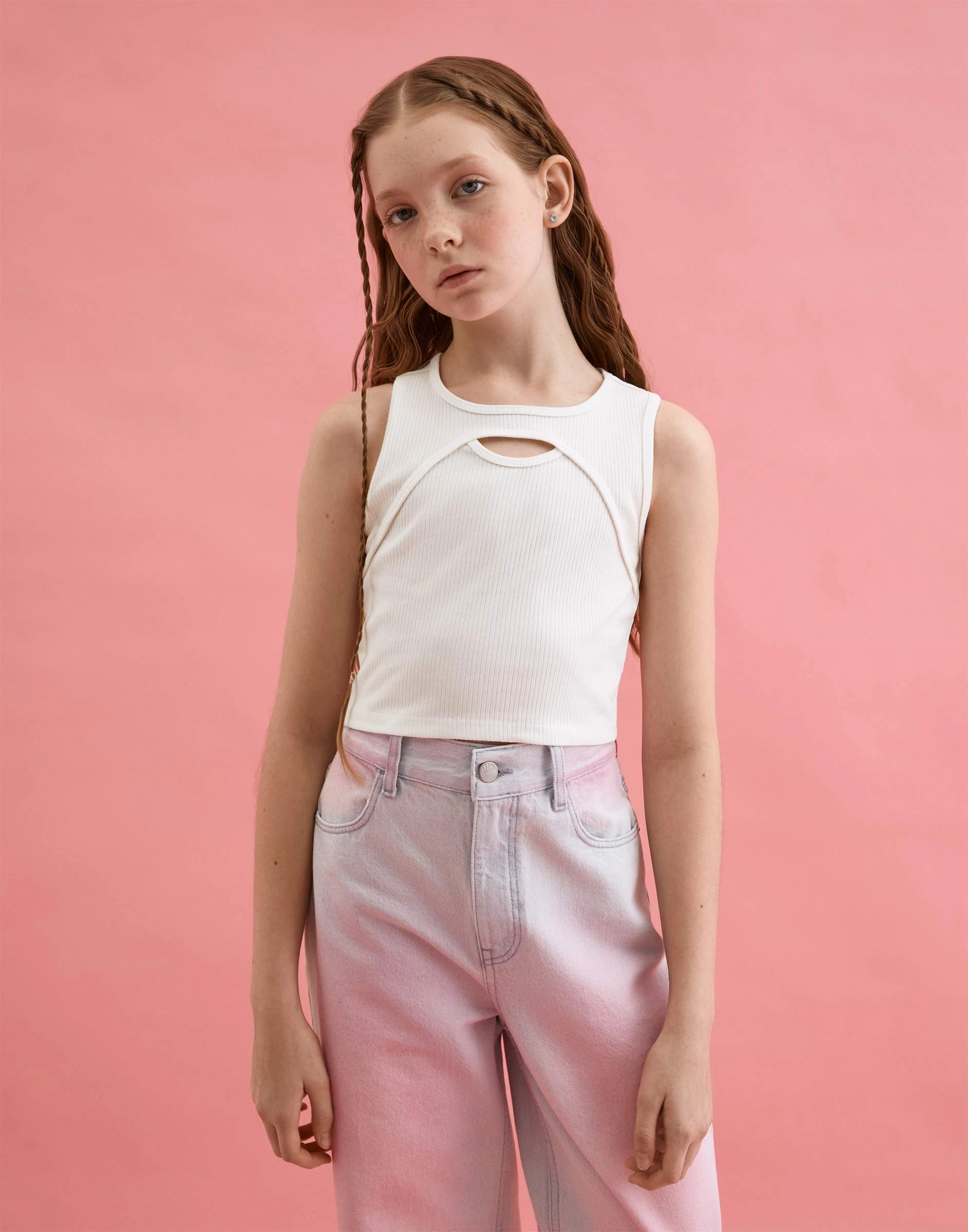 Молочный кроп-топ в рубчик с вырезом Gtn004585-1