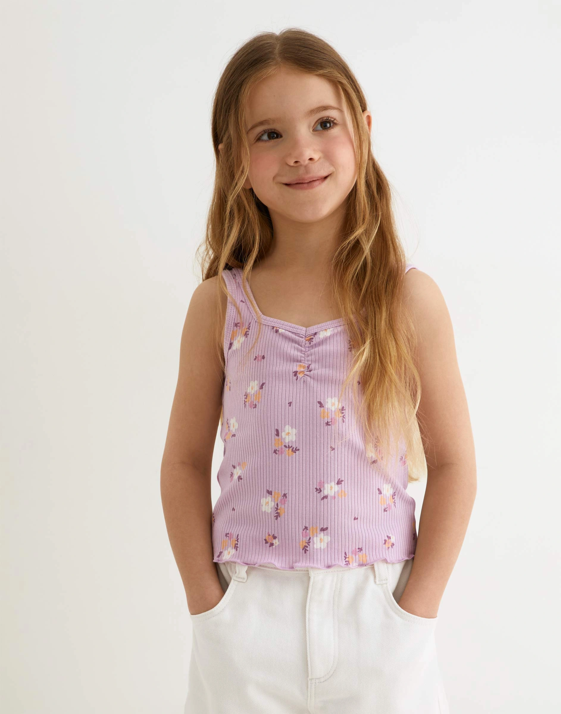 Сиреневая майка в рубчик с тотальным принтом для девочки Gtn004389-1