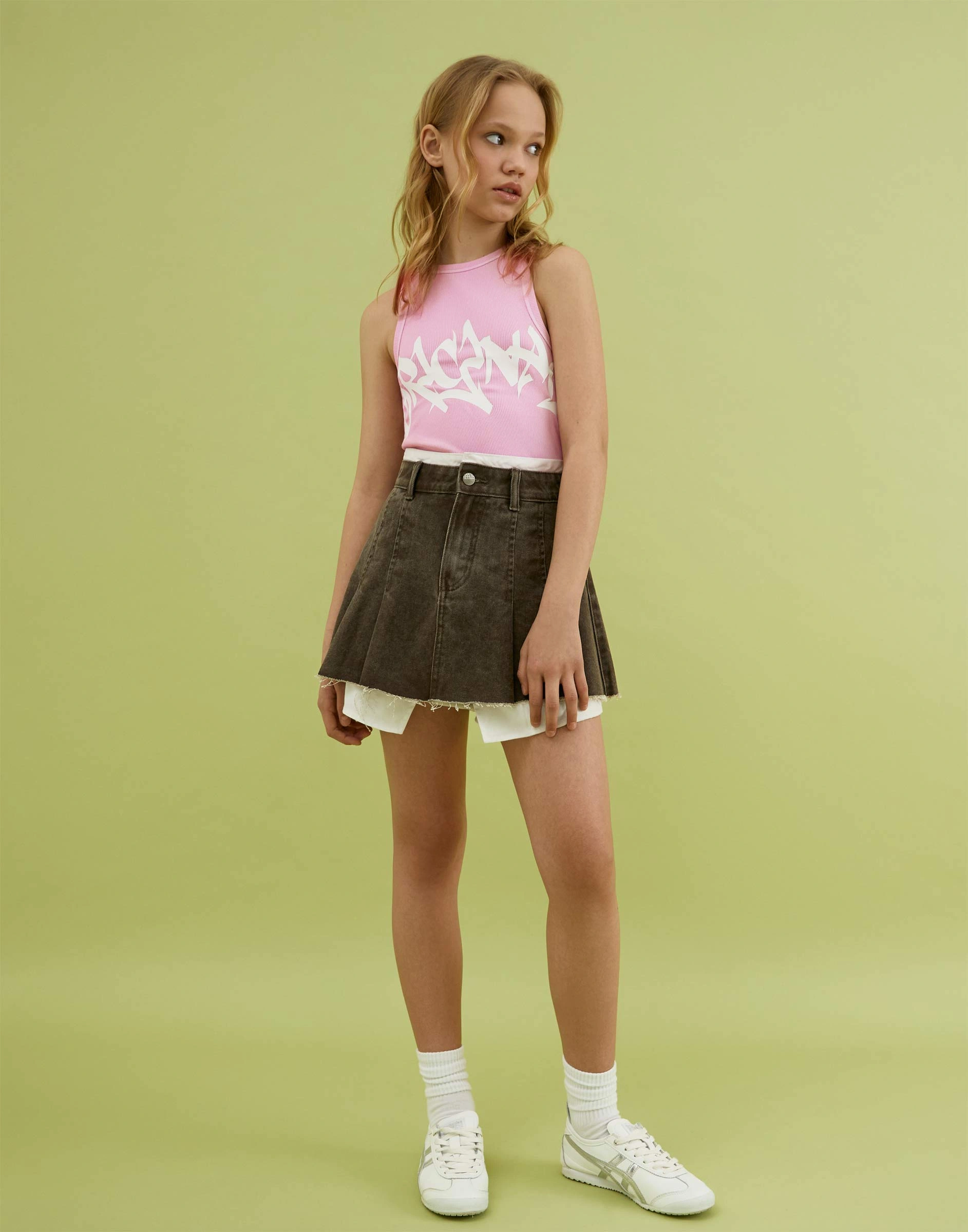 Розовая майка в рубчик с принтом и контрастными строчками Gtn004707-1