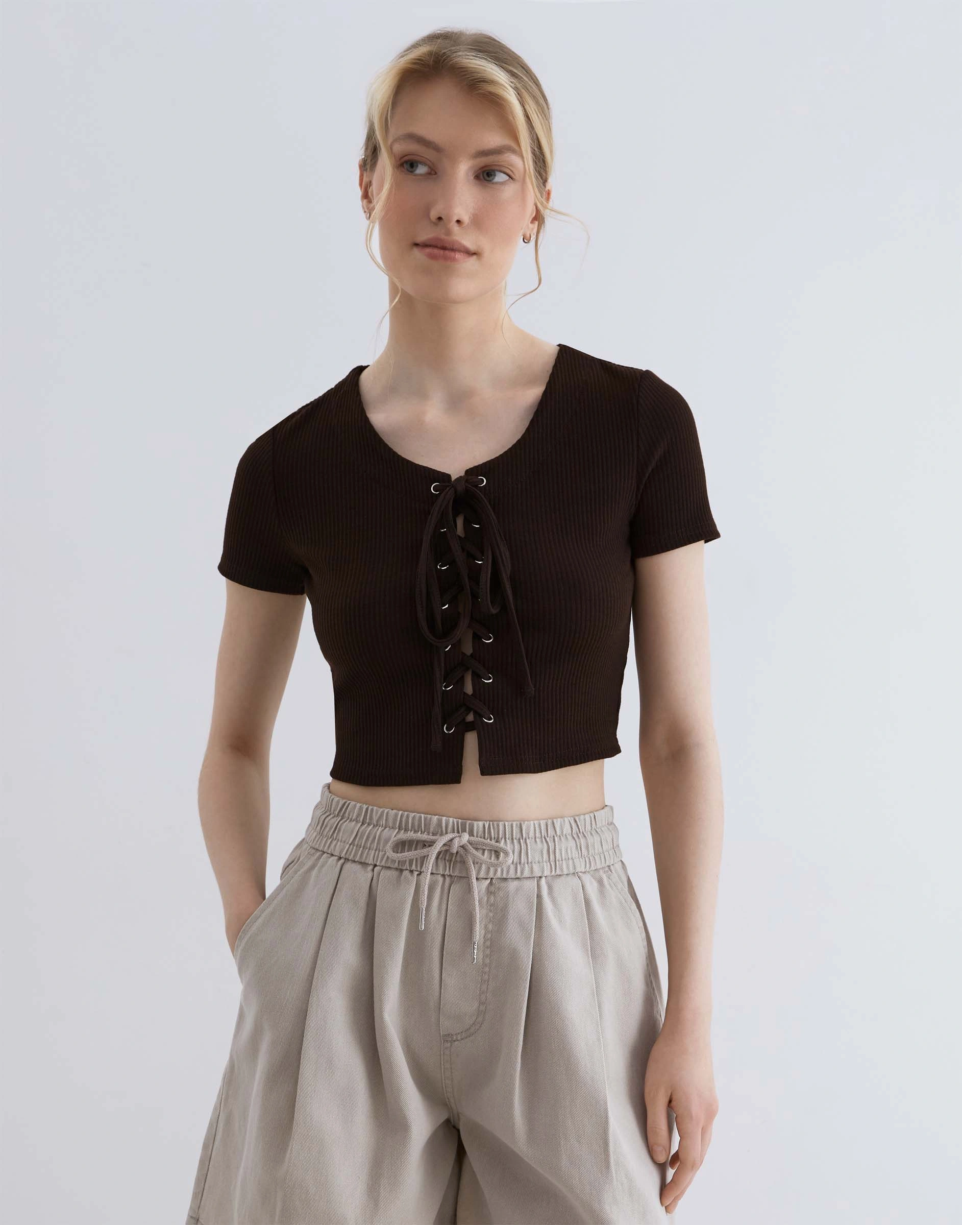 Коричневый кроп-топ в рубчик со шнуровкой Gkt026036-3