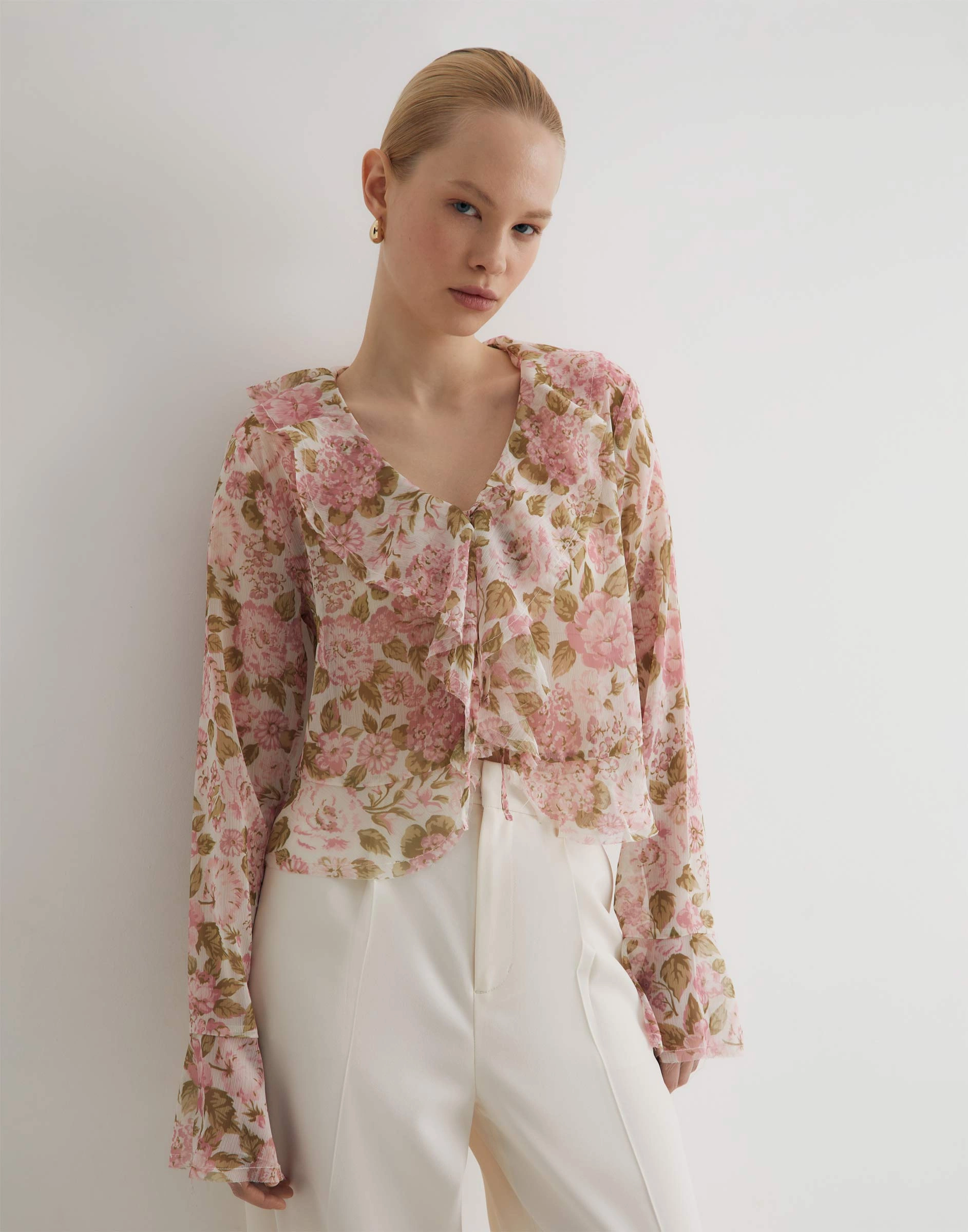 Розовая укороченная блузка с оборками и принтом Gwt004556-1