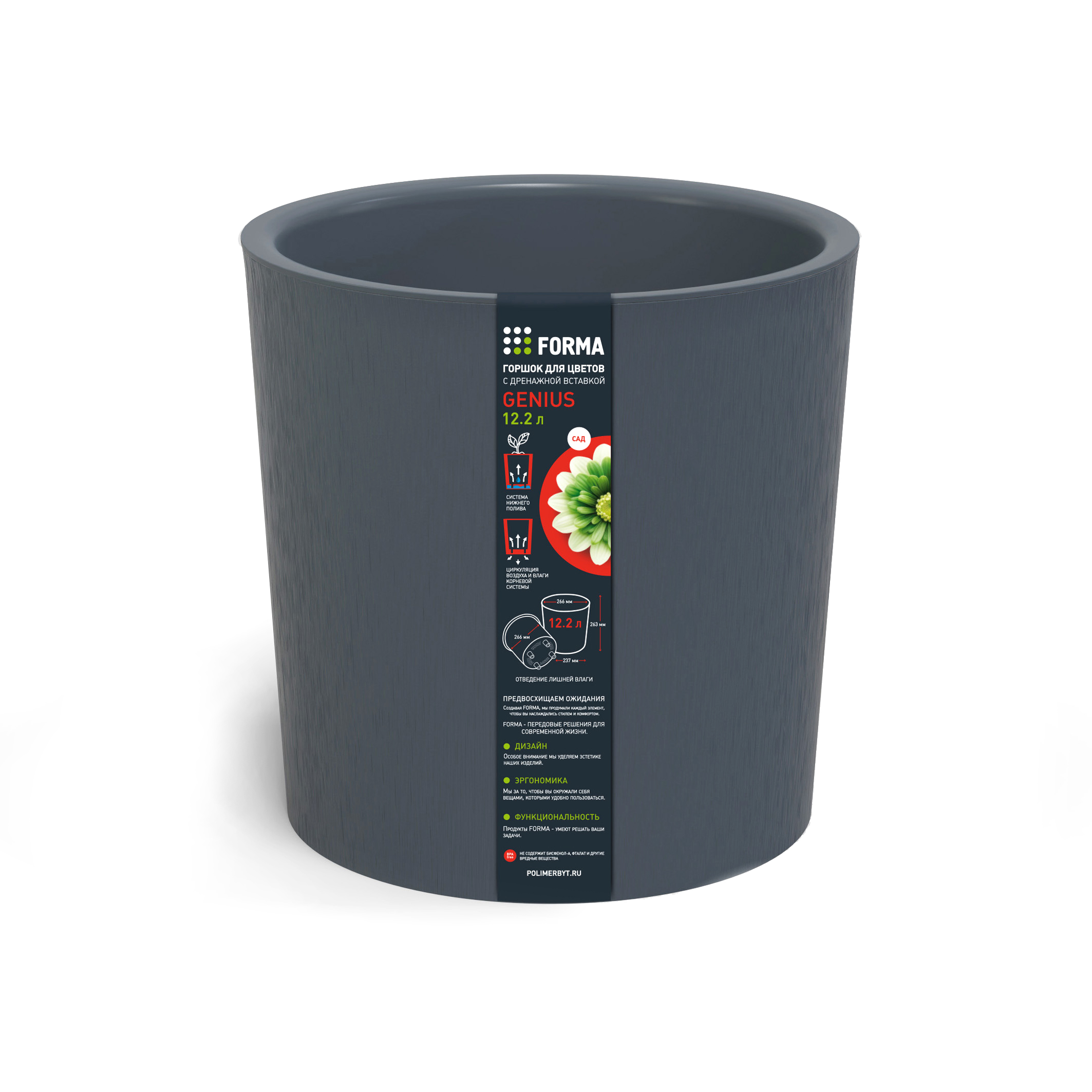 Горшок для цветов с дренажной вставкой пластик Genius 12.2 л d266 h263 мм серый
