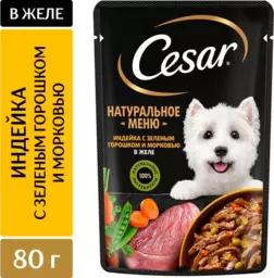 Корм влажный для взрослых собак Cesar Natural Goodness с индейкой горохом и морковью в желе, 80 г