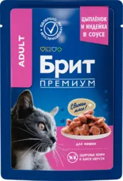 Влажный корм для кошек Брит Премиум с цыпленком и индейкой кусочки в соусе, 85 г