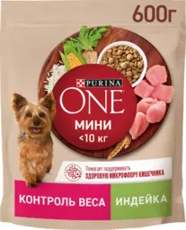 Корм сухой Purina One Мини для собак мелких пород склонных к набору веса или стерилизованных с индейкой и с рисом 600г