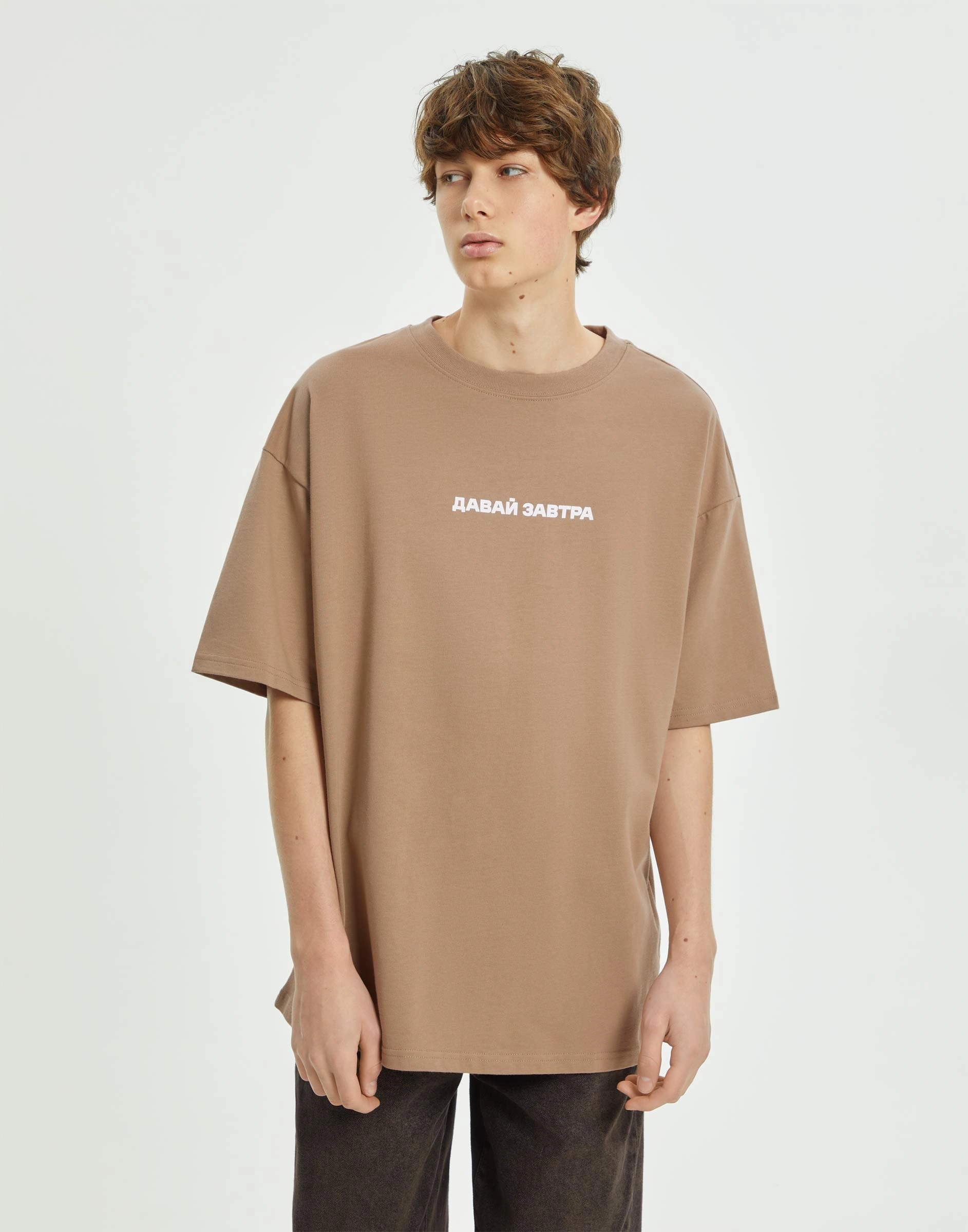 Бежевая футболка oversize с русским текстом Давай завтра Bkt017878-1