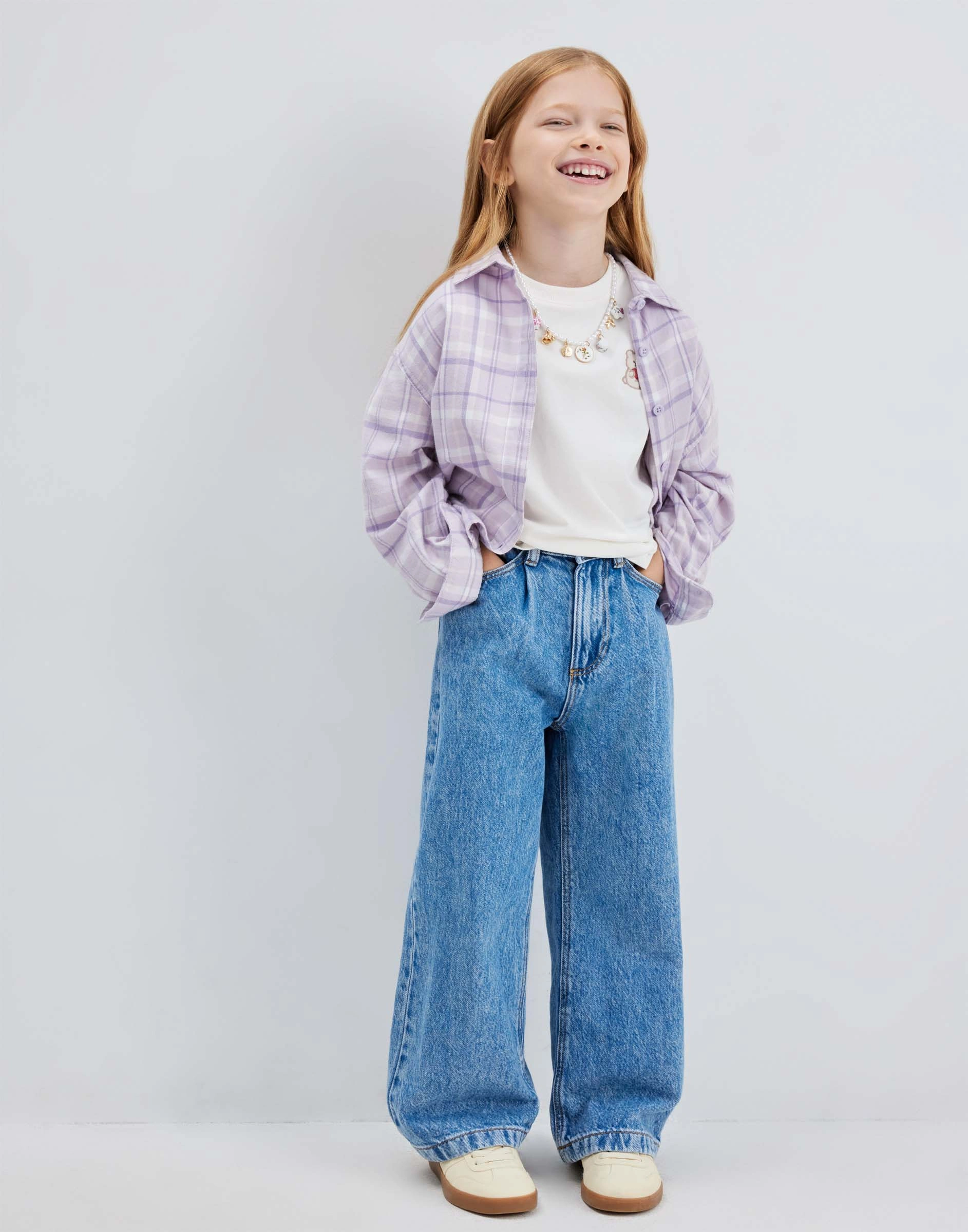 Сиреневая рубашка oversize в клетку с лейблом для девочки Gwt004706-1