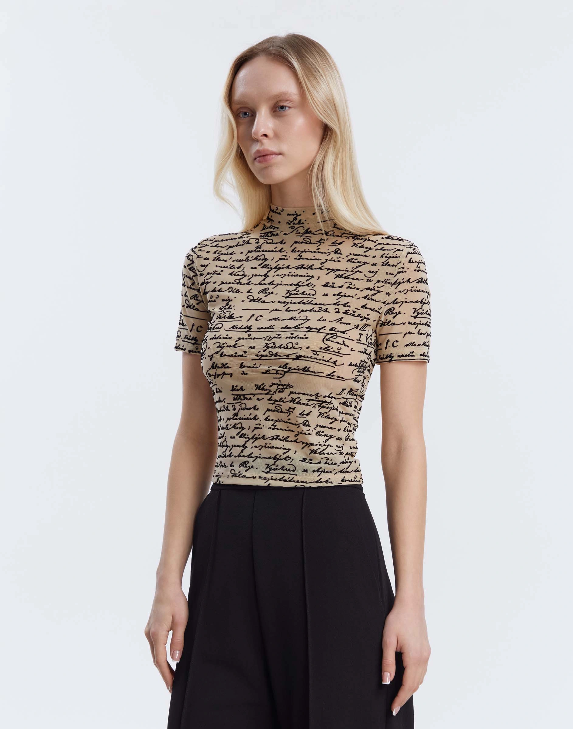 Бежевый кроп-топ с тотальным принтом Gkt026366-1